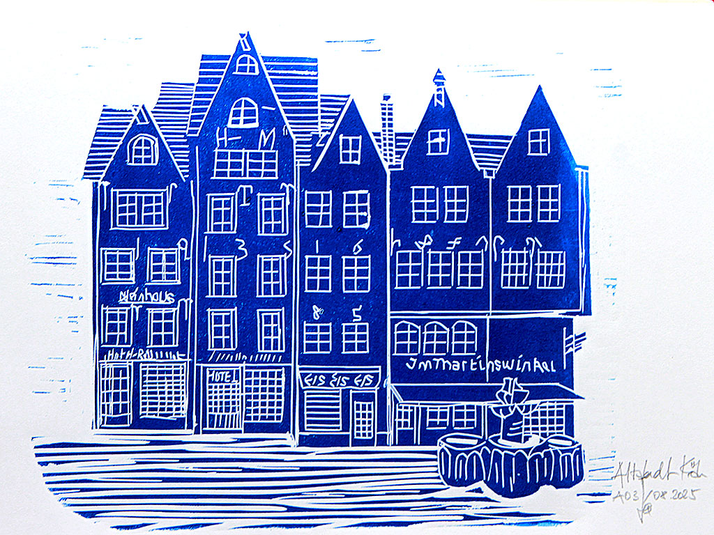 Es gibt Kölner:innen, die sagen es sind die schönsten Häuser in der Altstadt am Kölner Fischmarkt. Zwei Häuser wurden abgerissen. Es sind die Häuser Fischmarkt 1-3. Der Linolschnitt zeigt die Silhouette der fünf Häuser vor dem Abriss. Linoldruck mit blauer Farbe auf Büttenpapier im Format DIN A 4 von Hand gedruckt, nummeriert und signiert.