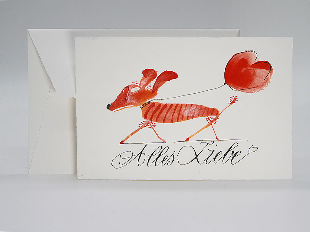 Grußkarte: Hund mit Ballon in Herzform Für alle Hundeliebhaber ist diese Grußkarte zum Valentinstag ein Muss: Sie zeigt einen Hund, der an seinem Halsband einen Ballon in Herzform trägt. Die Karte ist handgemalt mit Aquarellfarbe und die Kalligraphie in der Schriftart Copperplate oder Englische Schreibschrift ausgeführt. Hochwertige Büttenpapier bei Karte und Umschlag.