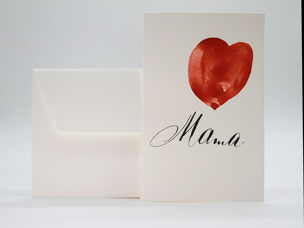 Von Hand kalligraphierte Karte zum Muttertag mit von Hand gemalten Herz auf Büttenpapier mit Umschlag aus Büttenpapier. Es handelt sich um ein exklusives und einmaliges Stück – um ein Original Unikat.