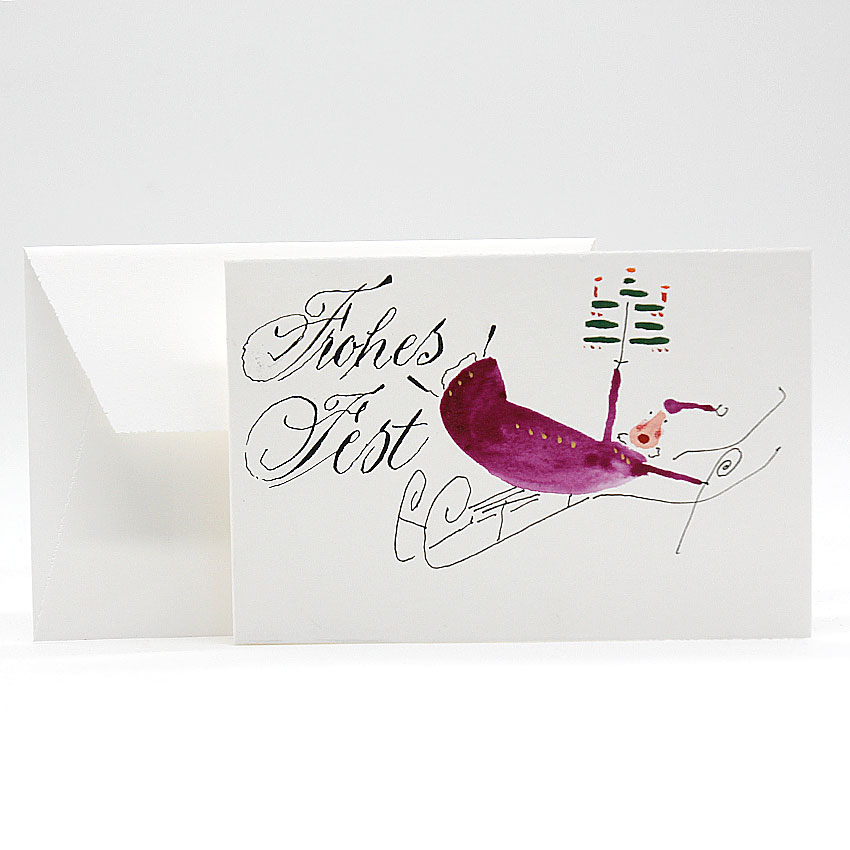 Originelle handgemalte und kalligraphierte Weihnachtskarte: Weihnachtsmann mit Schlitten unterwegs
